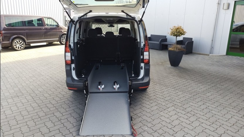 Der Volkswagen Caddy V Maxi ist das ideale Fahrzeug für den Transport von Rollstuhlfahrern. Durch einen Heckausschnitt in Verbindung mit einer Auffahrrampe lässt sich der Rollstuhlfahrer leicht in das Innere des Fahrzeuges schieben und mit dem vorhandenen Gurtsystem sicher befördern.